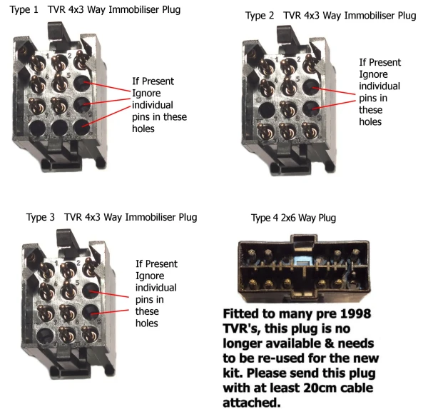 Unfortunately the new Evo system cannot be programmed with the old style Meta fobs including the M300 as used by TVR Please choose the type of plug fitted to the M36 immobiliser fitted to your vehicle. Please note Plug 'A' is no longer being manufactured, as such the original plug will have to be re-used. You can either send your old M36 with the plug (or the plug on its own with at least 20cm of cable attached) for us to swap over (free of charge) or we can send instructions of how to swap over with the replacement M36T2 immobiliser (some soldering skills will be necessary). If plugs B, C or D are chosen the immobiliser will come ready fitted with the appropriate plug/pin combination. If you require plug A and it is not available in the dropdown list please contact the office on 0208 677 1999 Fob Options - Choose Above
